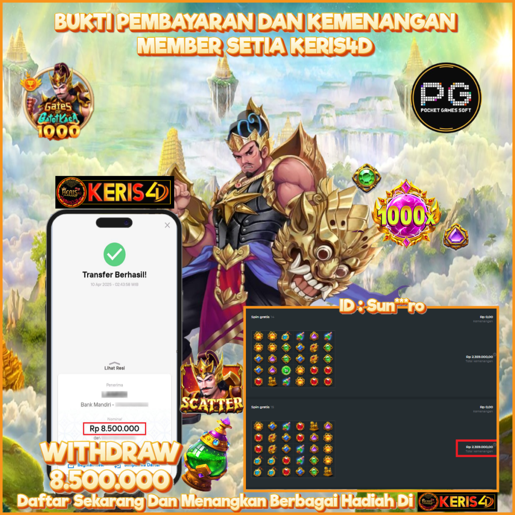 KERIS4D dikenal sebagai situs terpercaya yang selalu menghadirkan pengalaman bermain slot online yang aman, fair, dan berlisensi resmi. Di sini, kami tidak hanya sekadar memberikan janji, tapi bukti nyata berupa slip kemenangan yang dapat Anda lihat secara langsung.