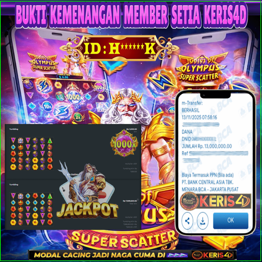 KERIS4D dikenal sebagai situs terpercaya yang selalu menghadirkan pengalaman bermain slot online yang aman, fair, dan berlisensi resmi. Di sini, kami tidak hanya sekadar memberikan janji, tapi bukti nyata berupa slip kemenangan yang dapat Anda lihat secara langsung.