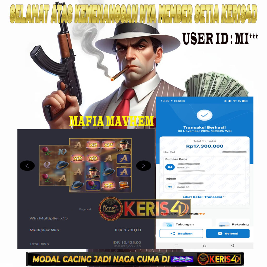 KERIS4D dikenal sebagai situs terpercaya yang selalu menghadirkan pengalaman bermain slot online yang aman, fair, dan berlisensi resmi. Di sini, kami tidak hanya sekadar memberikan janji, tapi bukti nyata berupa slip kemenangan yang dapat Anda lihat secara langsung.