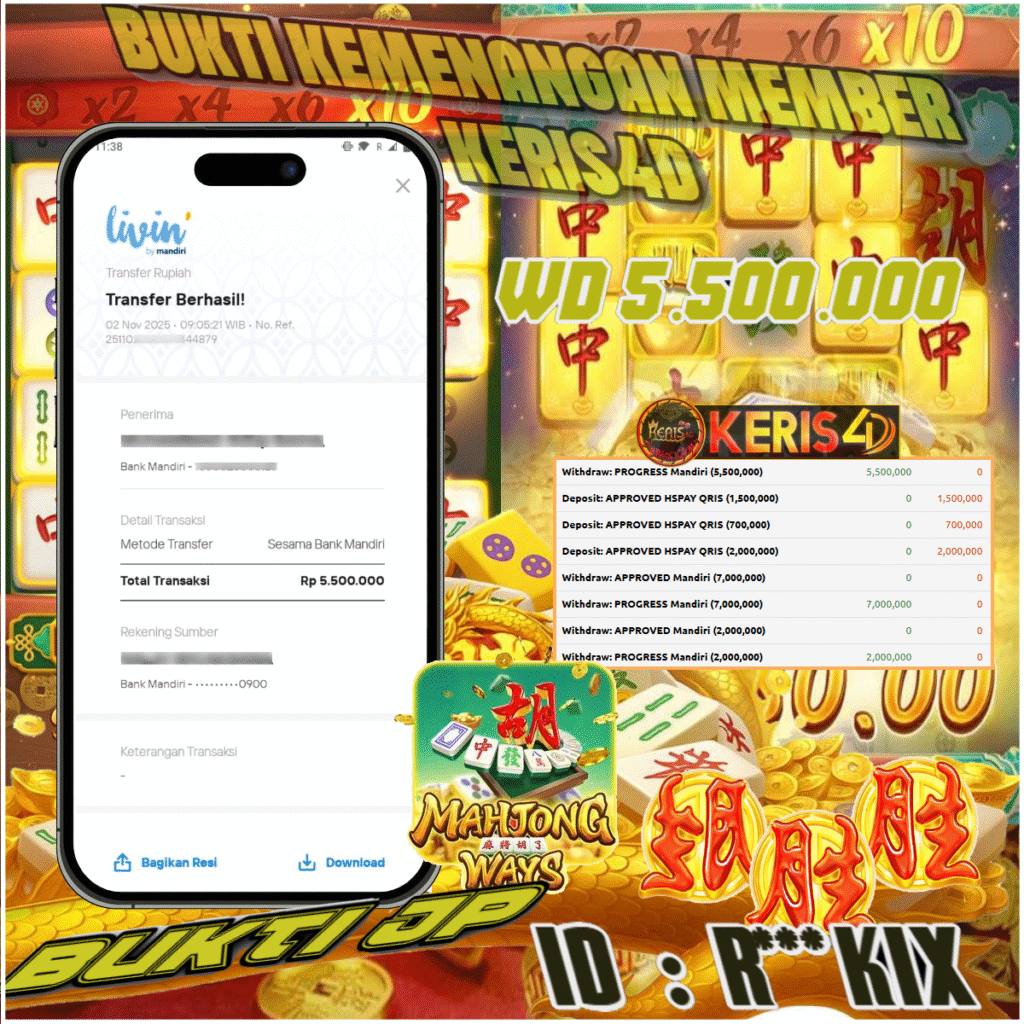 Setiap hari, member KERIS4D berhasil meraih jackpot besar dari berbagai provider slot ternama yang kami sediakan, seperti Pragmatic Play, Habanero, PG Soft, dan masih banyak lagi. Kami secara rutin menampilkan bukti screenshot atau rekapan kemenangan yang berhasil diraih, mulai dari kemenangan ratusan ribu hingga puluhan juta rupiah. Semua slip kemenangan ini kami hadirkan untuk membuktikan bahwa di KERIS4D, peluang menang itu nyata.