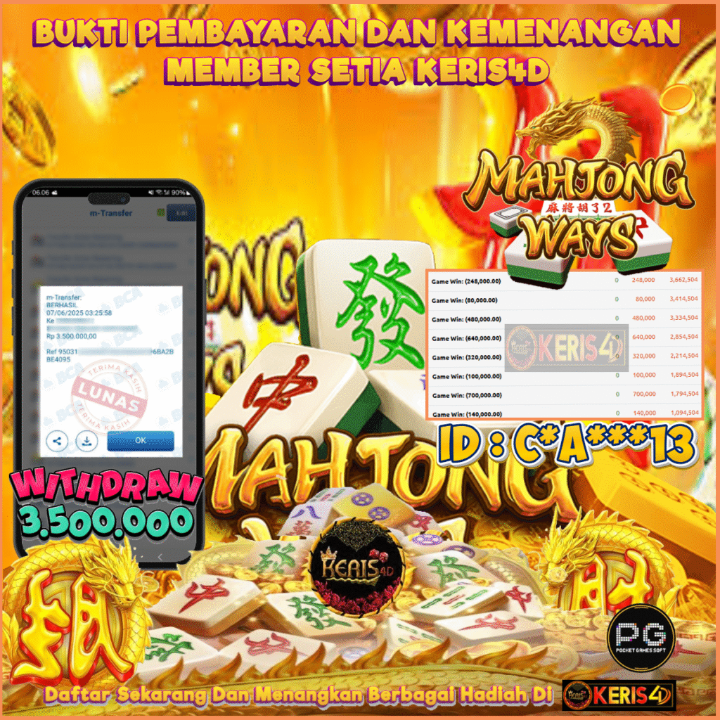 KERIS4D dikenal sebagai situs terpercaya yang selalu menghadirkan pengalaman bermain slot online yang aman, fair, dan berlisensi resmi. Di sini, kami tidak hanya sekadar memberikan janji, tapi bukti nyata berupa slip kemenangan yang dapat Anda lihat secara langsung.