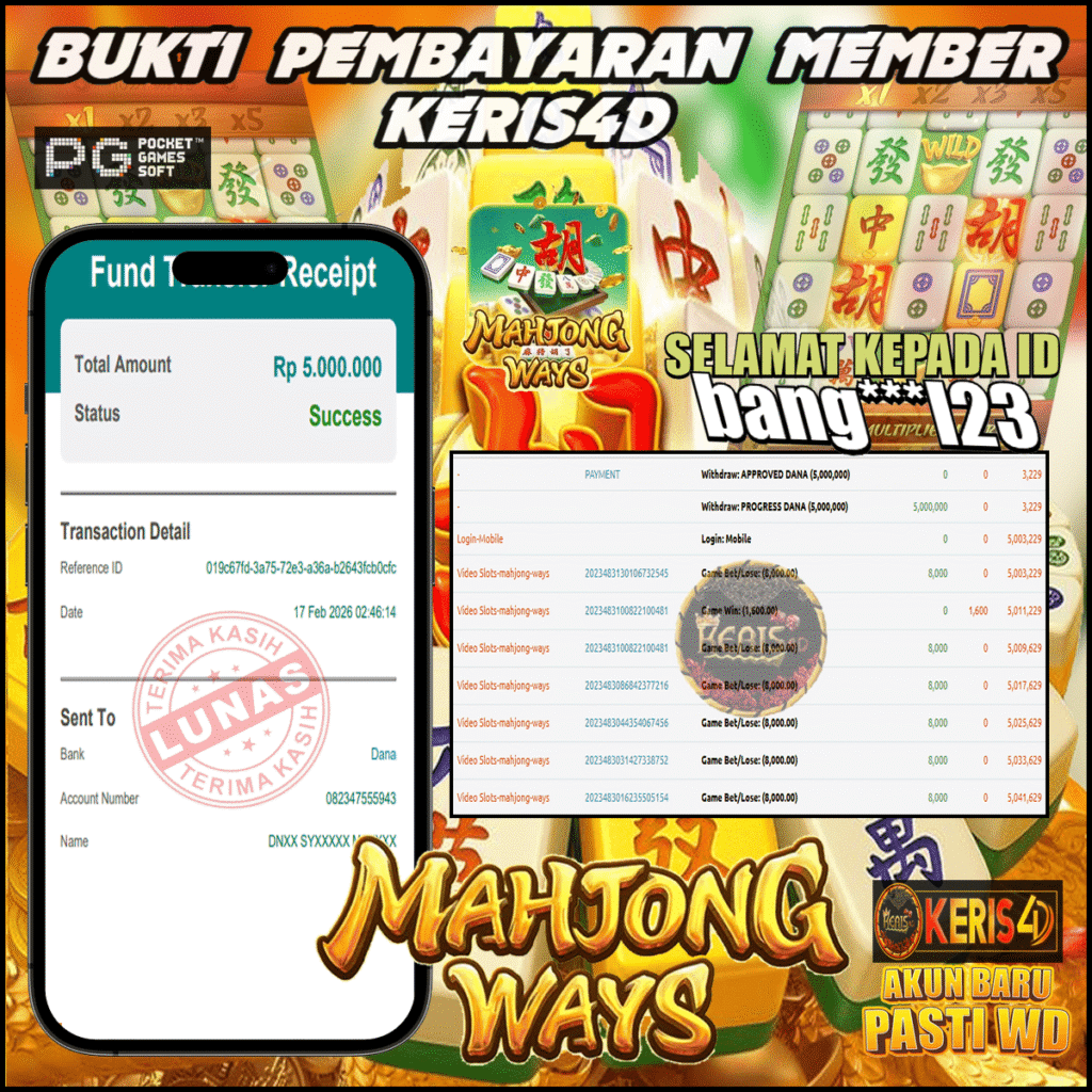 KERIS4D dikenal sebagai situs terpercaya yang selalu menghadirkan pengalaman bermain slot online yang aman, fair, dan berlisensi resmi. Di sini, kami tidak hanya sekadar memberikan janji, tapi bukti nyata berupa slip kemenangan yang dapat Anda lihat secara langsung.