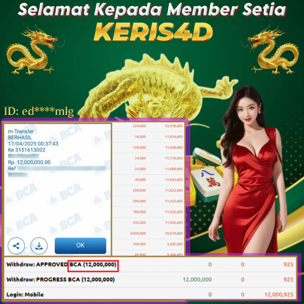 KERIS4D dikenal sebagai situs terpercaya yang selalu menghadirkan pengalaman bermain slot online yang aman, fair, dan berlisensi resmi. Di sini, kami tidak hanya sekadar memberikan janji, tapi bukti nyata berupa slip kemenangan yang dapat Anda lihat secara langsung.
