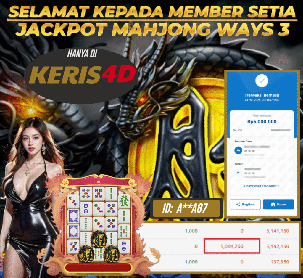 KERIS4D dikenal sebagai situs terpercaya yang selalu menghadirkan pengalaman bermain slot online yang aman, fair, dan berlisensi resmi. Di sini, kami tidak hanya sekadar memberikan janji, tapi bukti nyata berupa slip kemenangan yang dapat Anda lihat secara langsung.