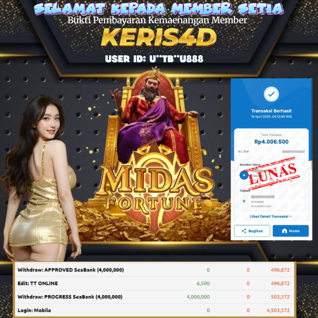 KERIS4D dikenal sebagai situs terpercaya yang selalu menghadirkan pengalaman bermain slot online yang aman, fair, dan berlisensi resmi. Di sini, kami tidak hanya sekadar memberikan janji, tapi bukti nyata berupa slip kemenangan yang dapat Anda lihat secara langsung.